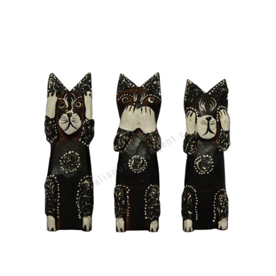 Wooden Cat Black Brown Closed Ears Mouth Eyes Set of 3